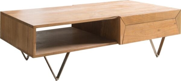 Konferenčný stolík Kayu 115x60 cm akácia prírodná 2 zásuvky podstava v tvare V nerezová oceľ
