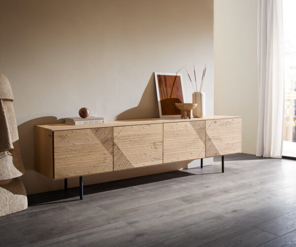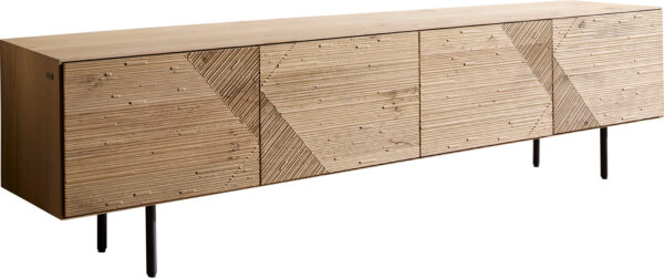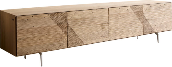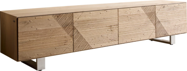 TV stolík Tereos 220 cm dub prírodný 3D efekt 4 dvierka okrúhla podstava kov čierna