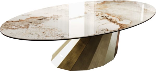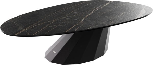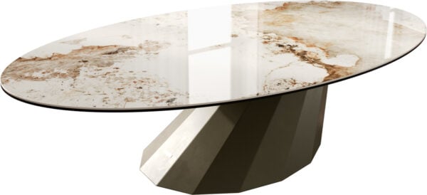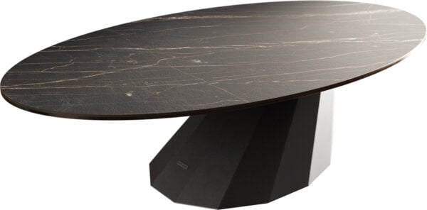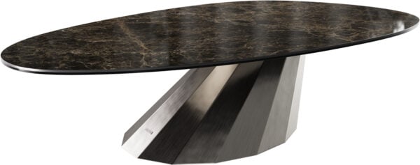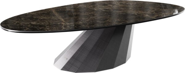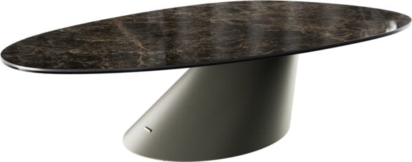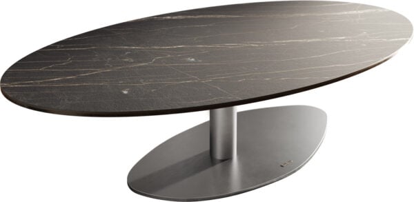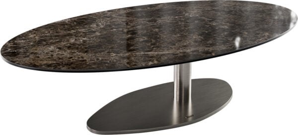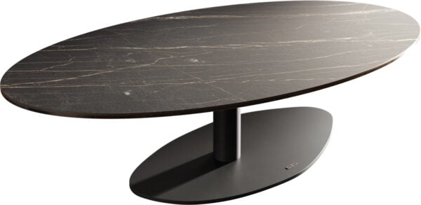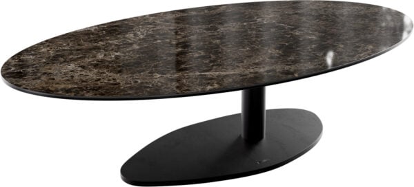 Konferenčný stolík Edge oválny 140x75 cm keramika Laminam® Emperador Extra Lucidato tmavohnedá Conis kov efektový povrch titánová farba