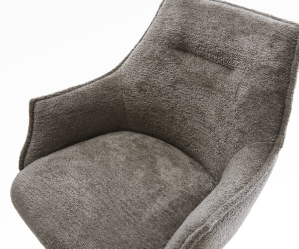 Táto stolička zaujme kvalitným poťahom z bouclé v teplom tmavobéžovom odtieni. Jemná štruktúra a pokojná farba dodávajú nábytku modernú, útulnú charizmu – ideálne do jedálne alebo čitateľského kútika.