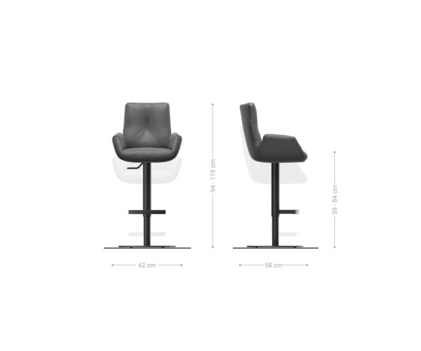 Podstava je vďaka širokému stojanu mimoriadne stabilná a odolná proti prevráteniu. Výškovo nastaviteľná plynovou pružinou sa barová stolička jednoducho prispôsobí tvojim potrebám. Barová stolička sa otáča o 360 stupňov a navyše disponuje praktickou opierkou na nohy, ktorá sedenie robí obzvlášť pohodlným a príjemným.