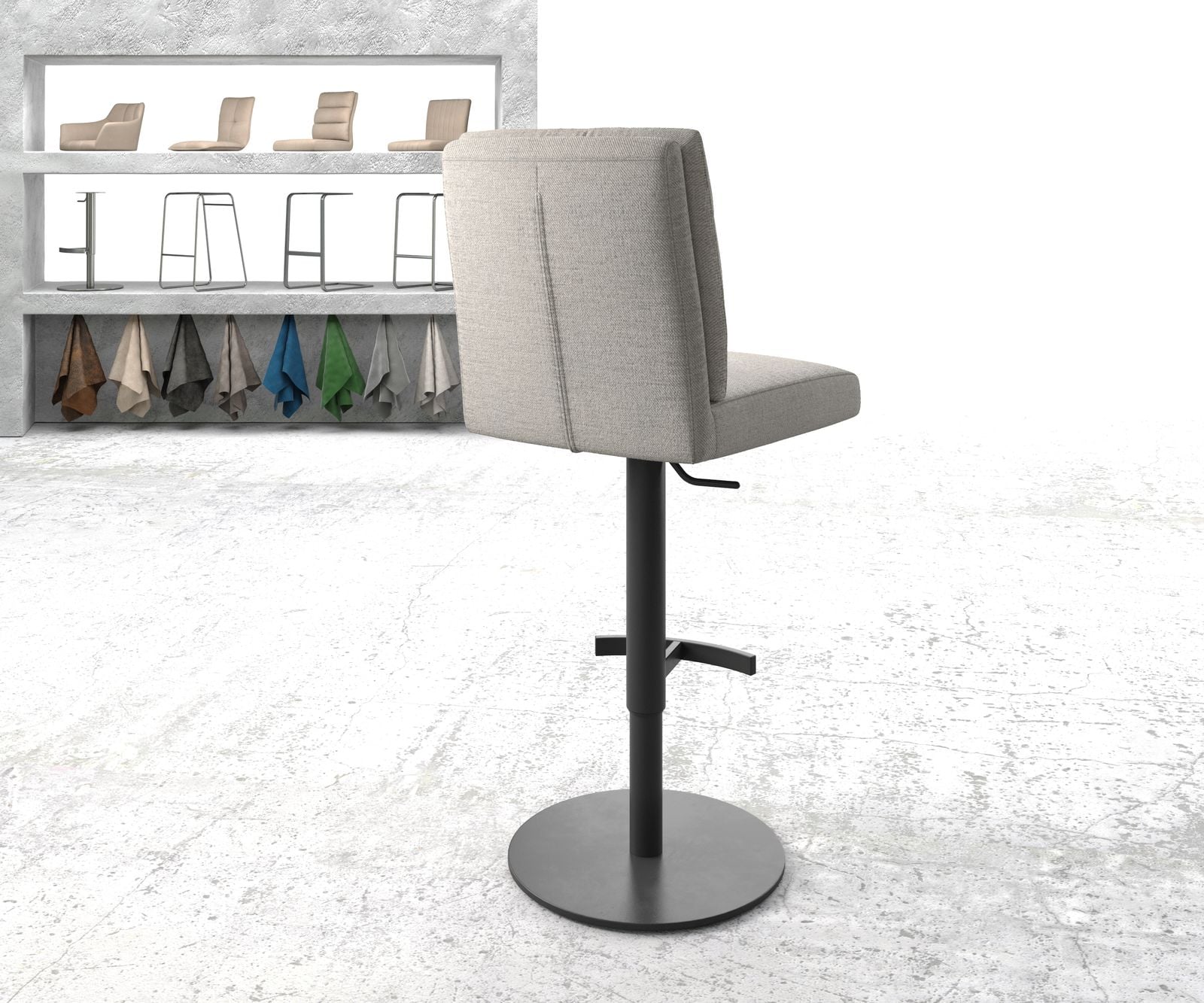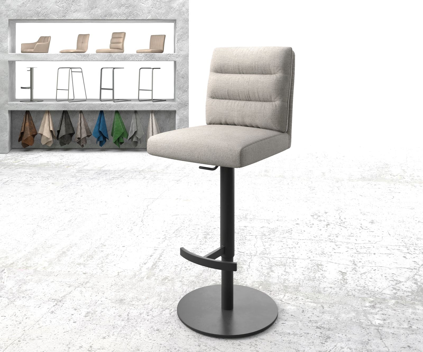 Podstava je vďaka širokému stojanu mimoriadne stabilná a odolná proti prevráteniu. Výšku barovej stoličky je možné jednoducho prispôsobiť vašim potrebám pomocou plynového piestu. Barová stolička sa otáča o 360 stupňov a navyše má praktickú opierku na nohy, ktorá sedenie robí obzvlášť príjemným a pohodlným.