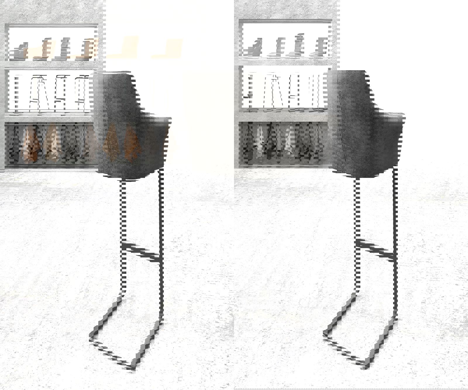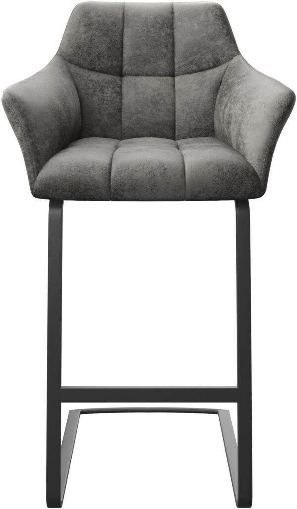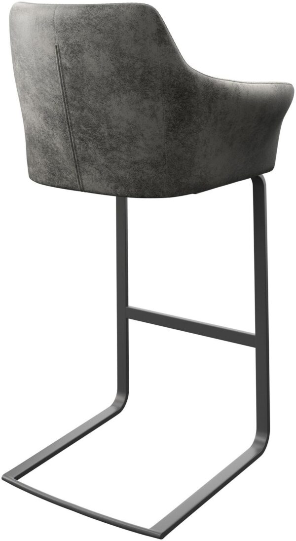 Barová stolička má výnimočnú podstavu v elegantnom tvare závesnej jedálenskej stoličky z moderného plochého kovu. Jej ľahká hojdacia funkcia robí sedenie obzvlášť šetrným k chrbtici. O dodatočný komfort sa stará stabilná opierka na nohy.