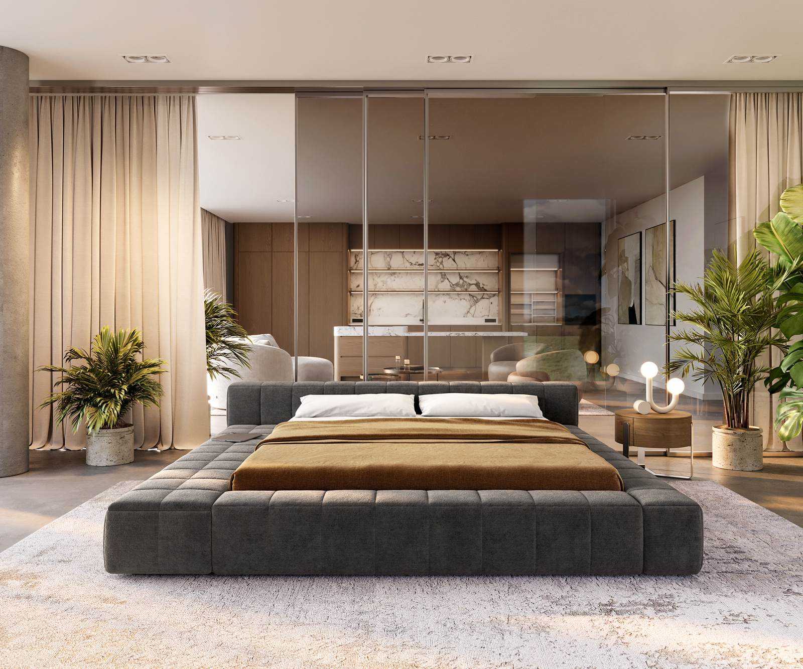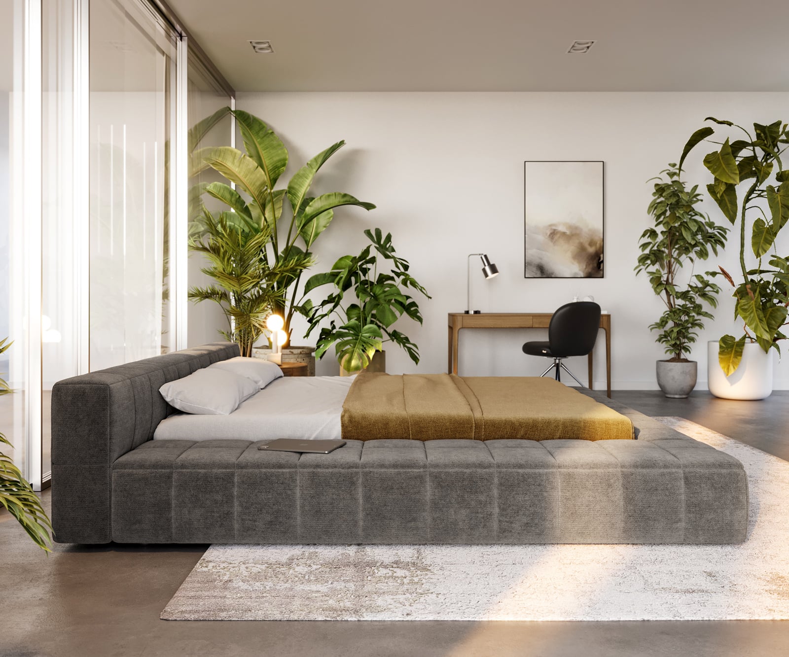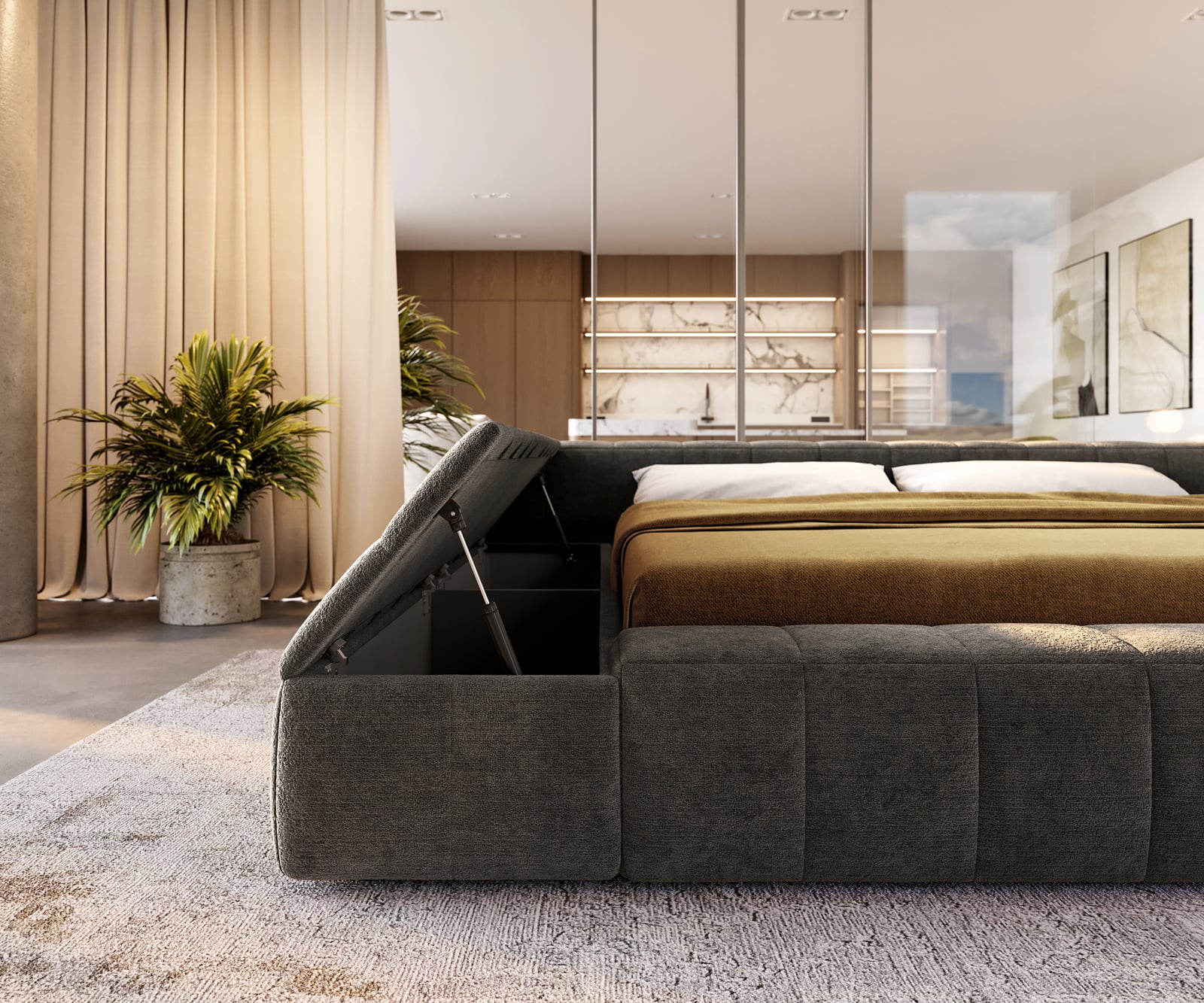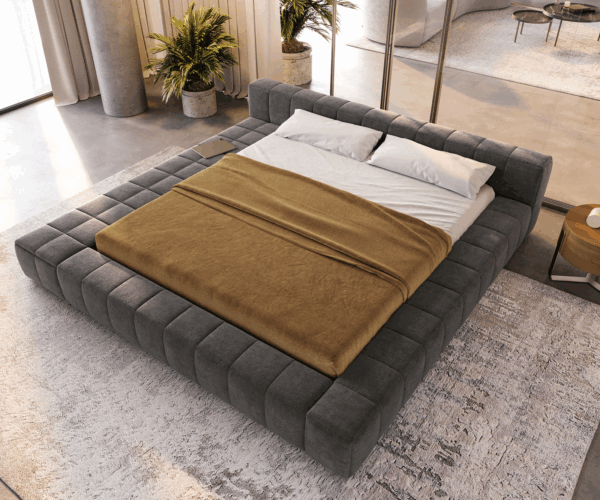 Táto posteľ spája modernú estetiku so zaujímavým výberom materiálov. Tmavobéžová tkanina Bouclé prináša do tvojej spálne štruktúru a eleganciu, zatiaľ čo premyslená odkladacia plocha s integrovaným úložným priestorom zabezpečuje čisté línie a poriadok. Perfektné pre všetkých, ktorí chcú zladiť dizajn a funkčnosť.