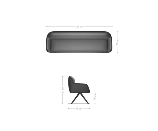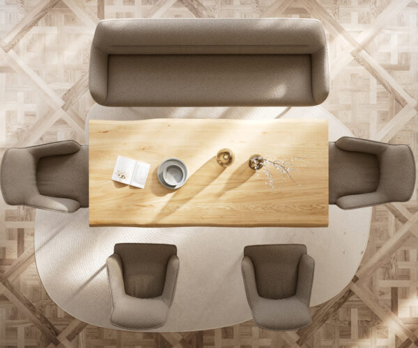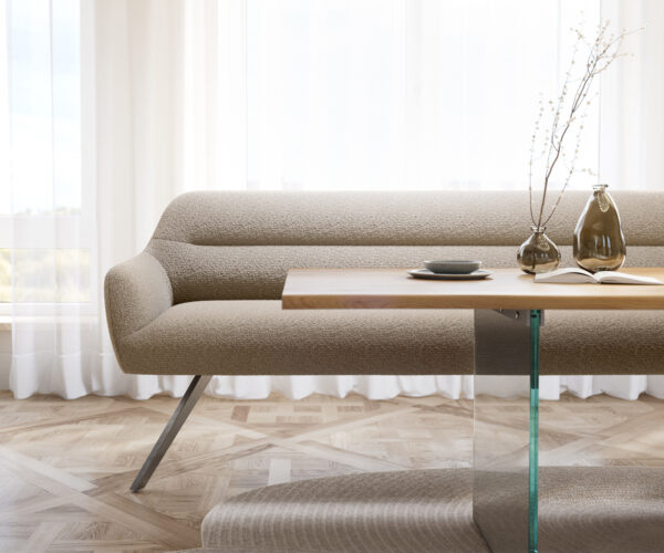 Naše stoličky Flex a stoly Edge dokonale nadväzujú na dizajnový jazyk lavice: tvary, línie a podstavy spolu harmonicky ladia. Stolíky Edge v dĺžke 2 metre ideálne dopĺňajú túto lavicu. K tomu odporúčame stoličky Flex Yago, Zoa, Pejo, Heira alebo Xana, ktoré si môžete podľa želania vybrať v rovnakom poťahu. Tak vznikne jedálenský priestor, ktorý ukazuje cit pre štýl – perfektne zladený a plný charakteru.