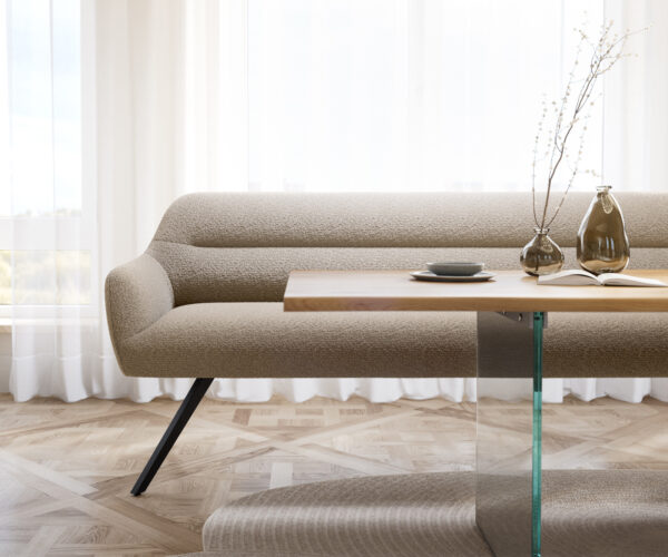 Naše stoličky Flex a stoly Edge dokonale nadväzujú na dizajnový jazyk lavice: tvary, línie a rámy spolu harmonicky ladia. Stoly Edge v dĺžke 2 metre ideálne dopĺňajú túto lavicu. K tomu odporúčame stoličky Flex Yago, Zoa, Pejo, Heira alebo Xana, ktoré si môžete podľa želania vybrať v rovnakom poťahu. Tak vznikne jedálenský priestor, ktorý prejavuje cit pre štýl – perfektne zladený a plný charakteru.