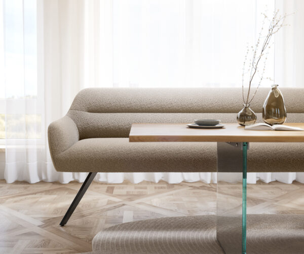 Luxusná látka bouclé v jemnom tmavobéžovom odtieni zaujme výraznou štruktúrou a mäkkým povrchom. Vďaka harmonickému farebnému prevedeniu sa materiál ľahko začlení do rôznych štýlov bývania a podčiarkuje moderný, útulný charakter lavicového systému.