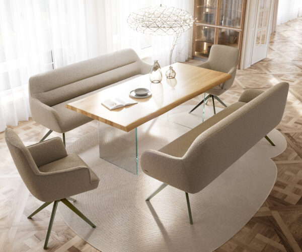 Naše stoličky Flex a stoly Edge dokonale nadväzujú na dizajnový jazyk lavice: tvary, línie a rámy spolu harmonicky ladia. Stoly Edge v dĺžke 2 metre ideálne dopĺňajú túto lavicu. K tomu odporúčame stoličky Flex Yago, Zoa, Pejo, Heira alebo Xana, ktoré si môžete na želanie vybrať v identickom poťahu. Tak vznikne jedálenský priestor, ktorý ukazuje štýlové cítenie – dokonale zladený a plný charakteru.