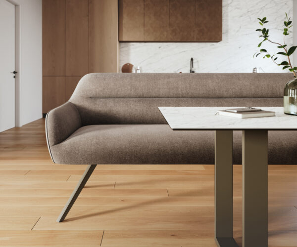 Naše stoličky Flex a stoly Edge dokonale nadväzujú na dizajnový jazyk lavice: tvary, línie a podstavy spolu harmonicky ladia. Stoly Edge s dĺžkou 2 metre ideálne dopĺňajú túto lavicu. K tomu odporúčame stoličky Flex Yago, Zoa, Pejo, Heira alebo Xana, ktoré si môžete na želanie vybrať v identickom poťahu. Tak vznikne jedálenský priestor, ktorý vyjadruje cit pre štýl – dokonale zladený a plný charakteru.