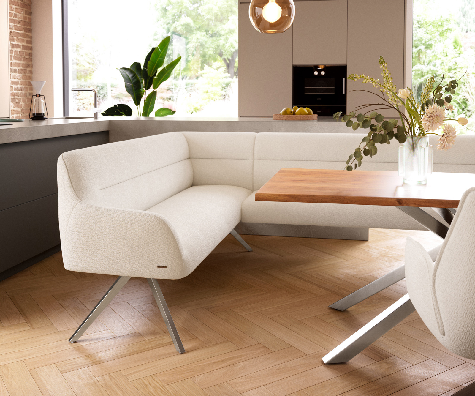 Jedálenská lavica Taya-Flex 285×190 cm bouclé bielo-krémová hranatá krížová podstava nerezová oceľ vrecková pružina pravá