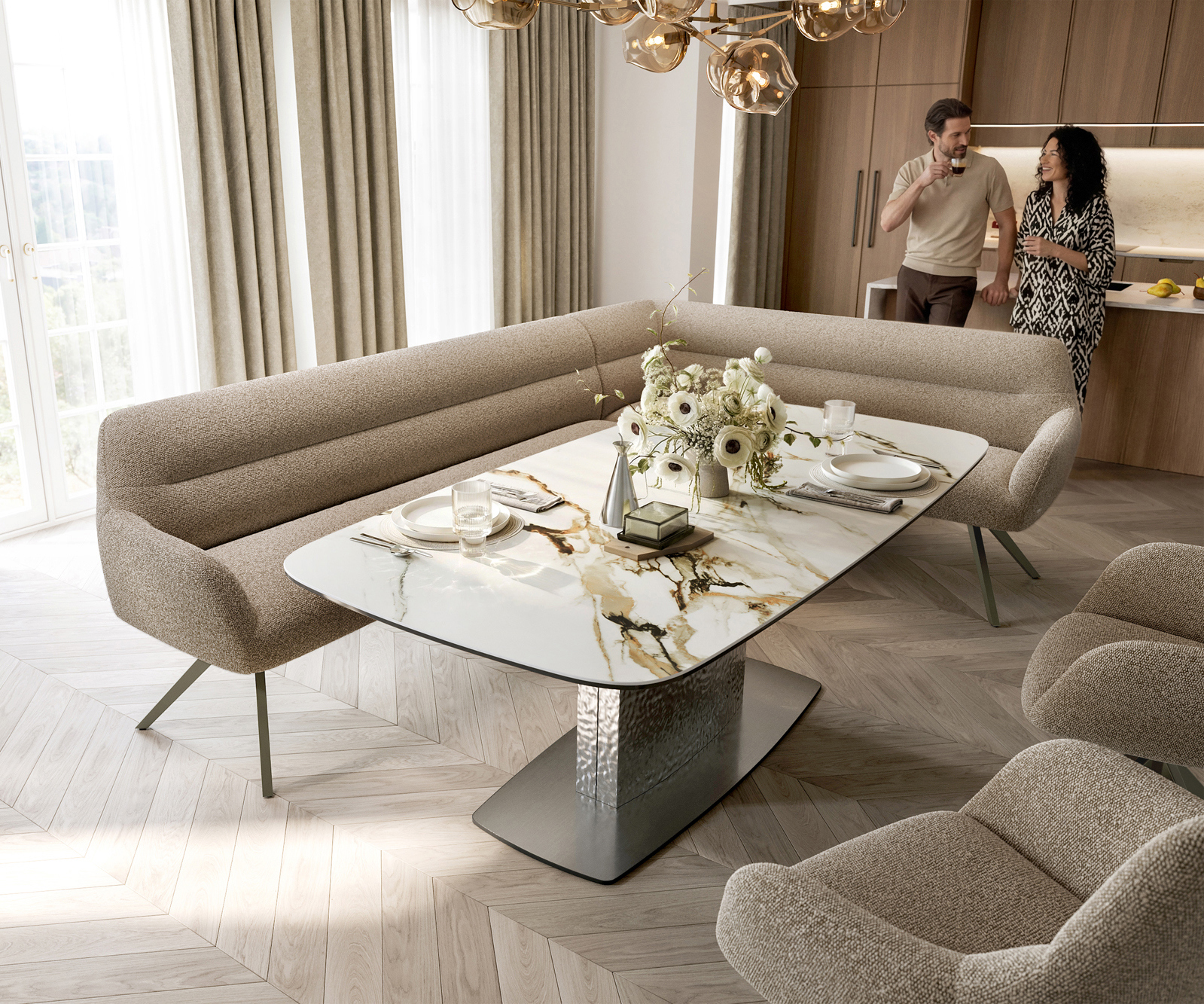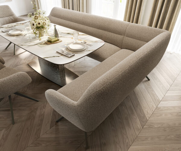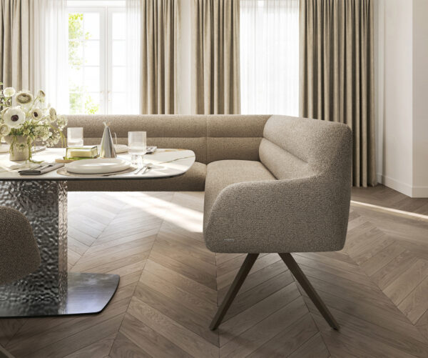 Rohová lavica Taya je súčasťou nášho premysleného systému a ideálne sa kombinuje s našimi stoličkami Flex a stolmi Edge. Tvary, línie a rámy spolu dokonale ladia a vytvárajú harmonický celok v jedálni. Pre toto rohové riešenie sú obzvlášť vhodné stoly Edge s dĺžkou 2 metre. K tomu odporúčame stoličky Flex Yago, Zoa, Pejo, Heira alebo Xana, ktoré si môžete vybrať v rovnakom poťahu. Tak vznikne jedálenský priestor, ktorý vyjadruje štýl – perfektne zladený a plný charakteru.