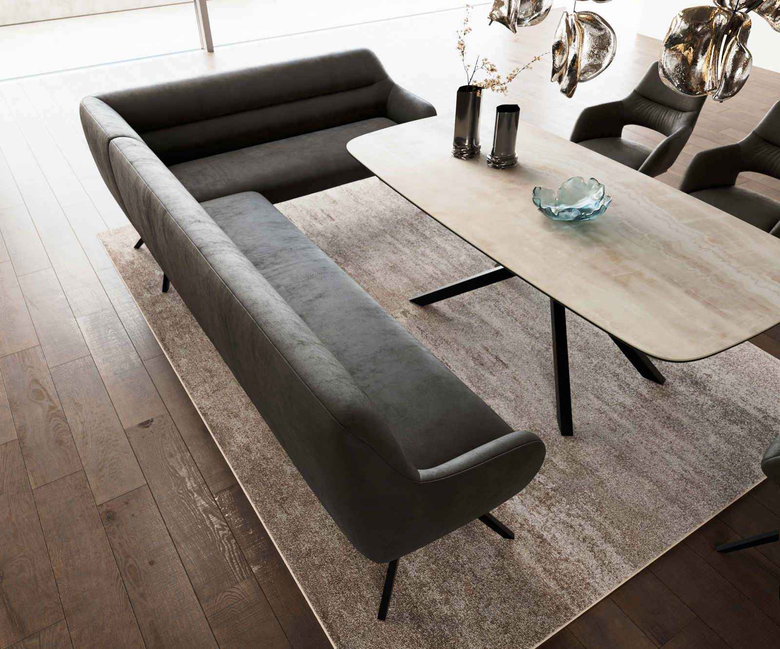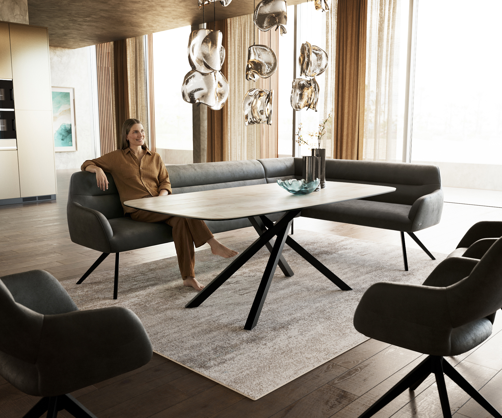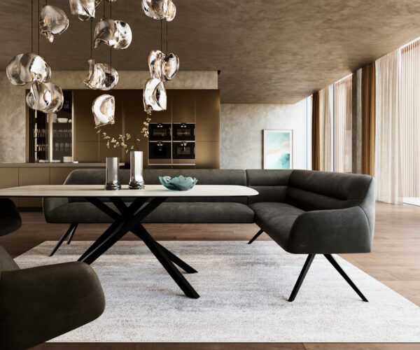 Rohová lavica Taya je súčasťou nášho premysleného systému a ideálne sa kombinuje s našimi jedálenskými stoličkami Flex a stolmi Edge. Tvary, línie a podstavy spolu dokonale ladia a vytvárajú harmonický celok v jedálni. Pre toto rohové riešenie sú obzvlášť vhodné Edge stoly s dĺžkou 2 metre. K tomu odporúčame jedálenské stoličky Flex Yago, Zoa, Pejo, Heira alebo Xana, ktoré si môžete podľa želania vybrať v rovnakom poťahu. Tak vznikne jedálenský priestor, ktorý vyjadruje cit pre štýl – perfektne zladený a plný charakteru.