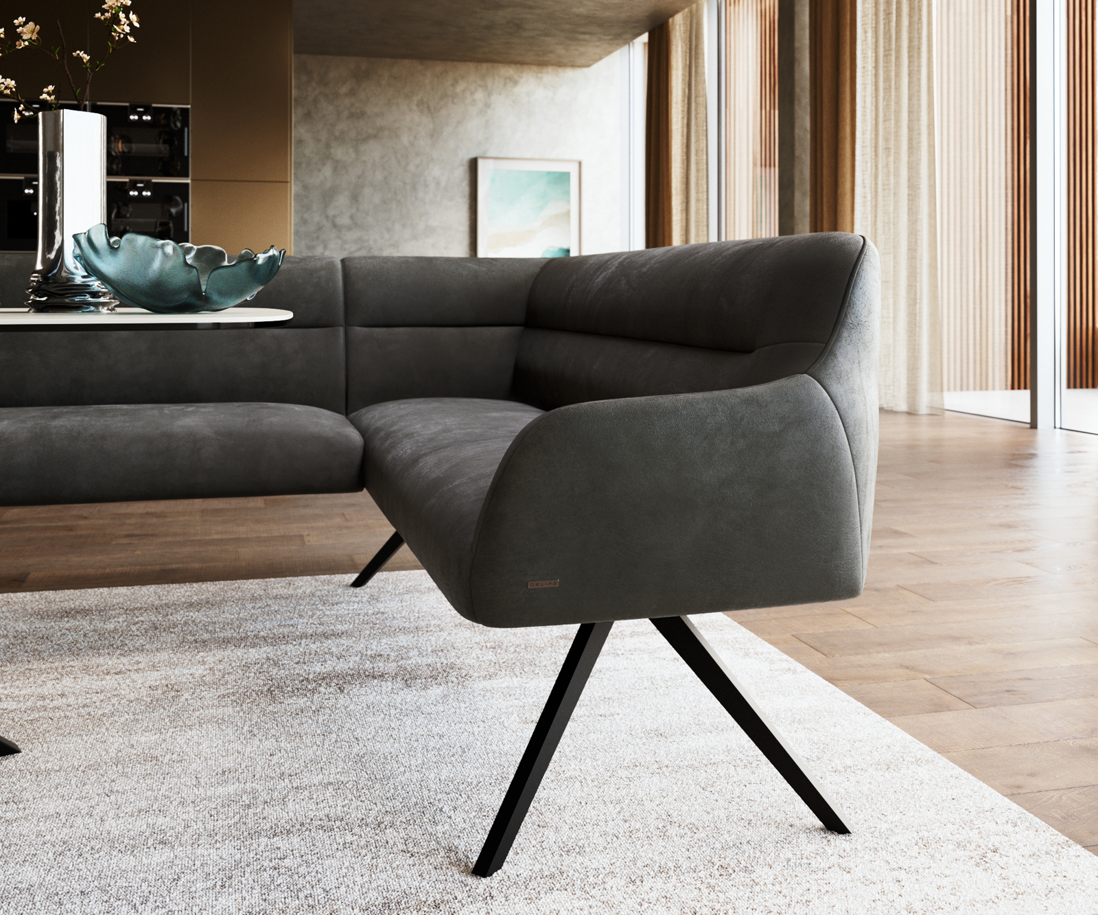 Podstava v čiernej farbe má vďaka práškovej povrchovej úprave rovnomerný matný povrch. Ten je mimoriadne odolný proti poškriabaniu a ľahko sa čistí. Tmavý odtieň dodáva lavici výraznú, modernú charizmu – ideálne do elegantných jedálenských priestorov.