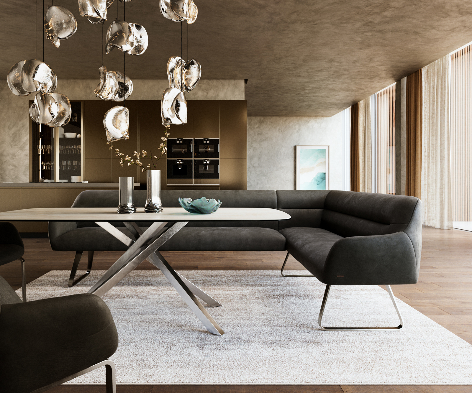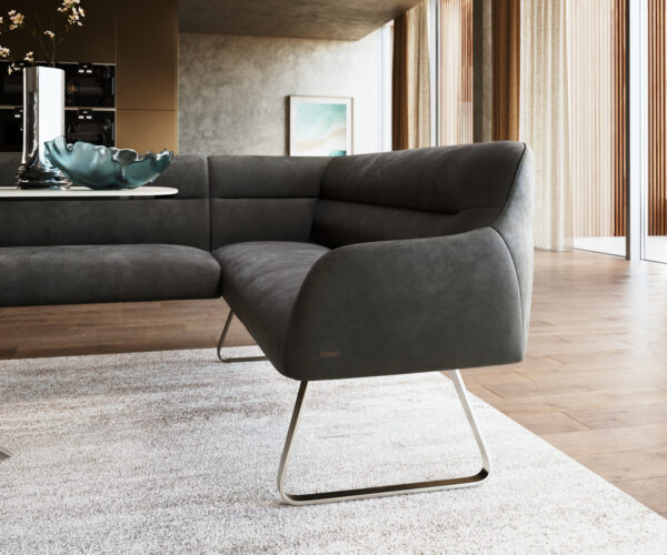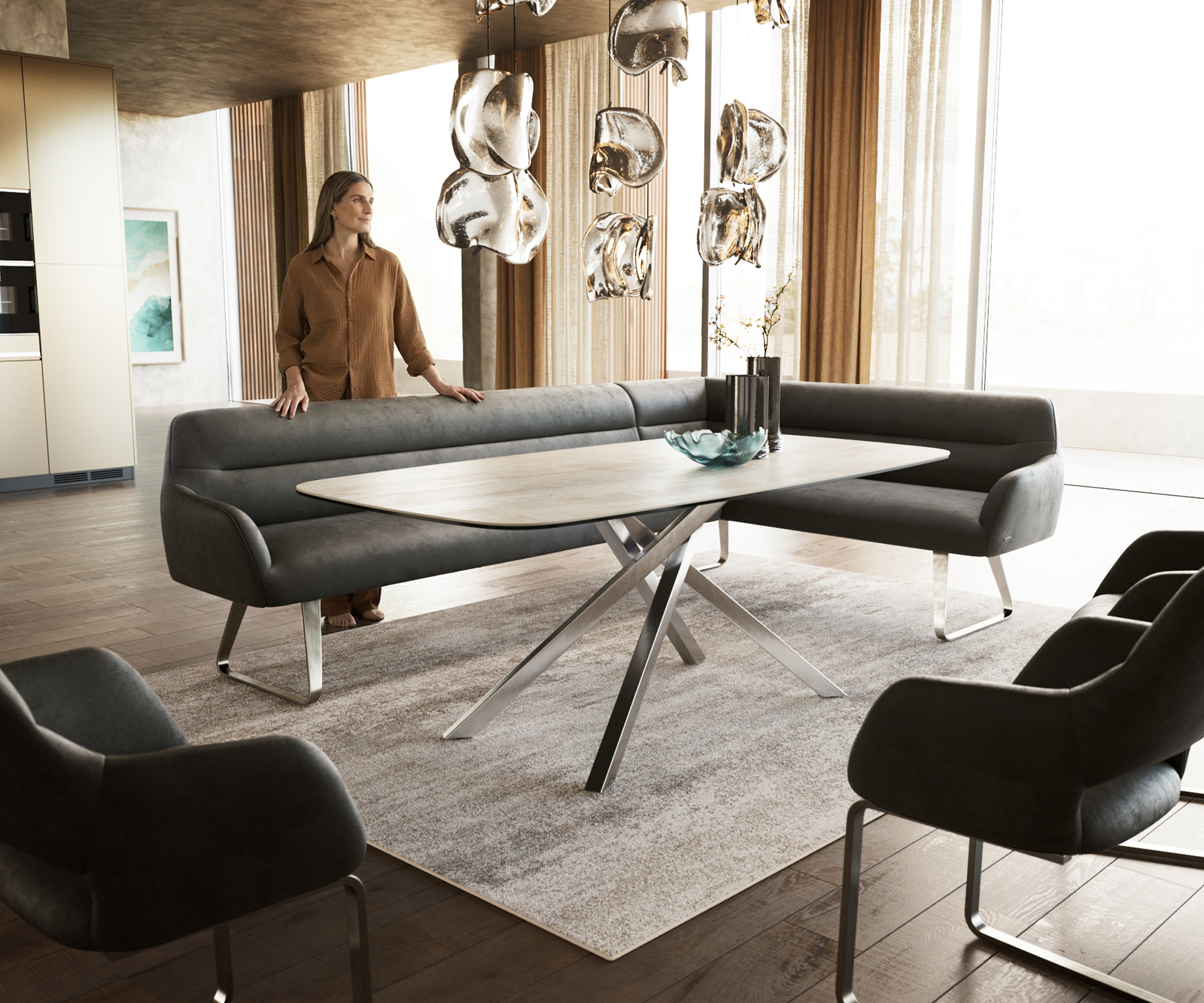 Plochý rám v tvare lyžiny dodáva jedálenskej lavici moderný a ľahký vzhľad. Šikmo vedené, decentne zaoblené línie zabezpečujú elegantnú, otvorenú siluetu. Vďaka súvislému tvaru vzniká harmonická rovnováha medzi stabilitou a dizajnom.