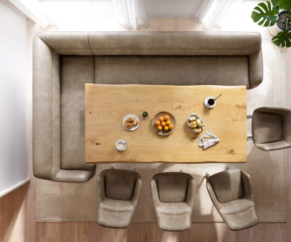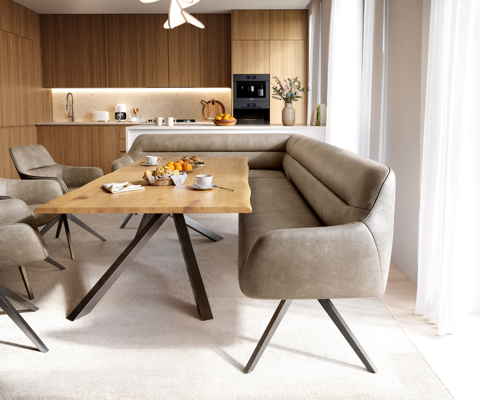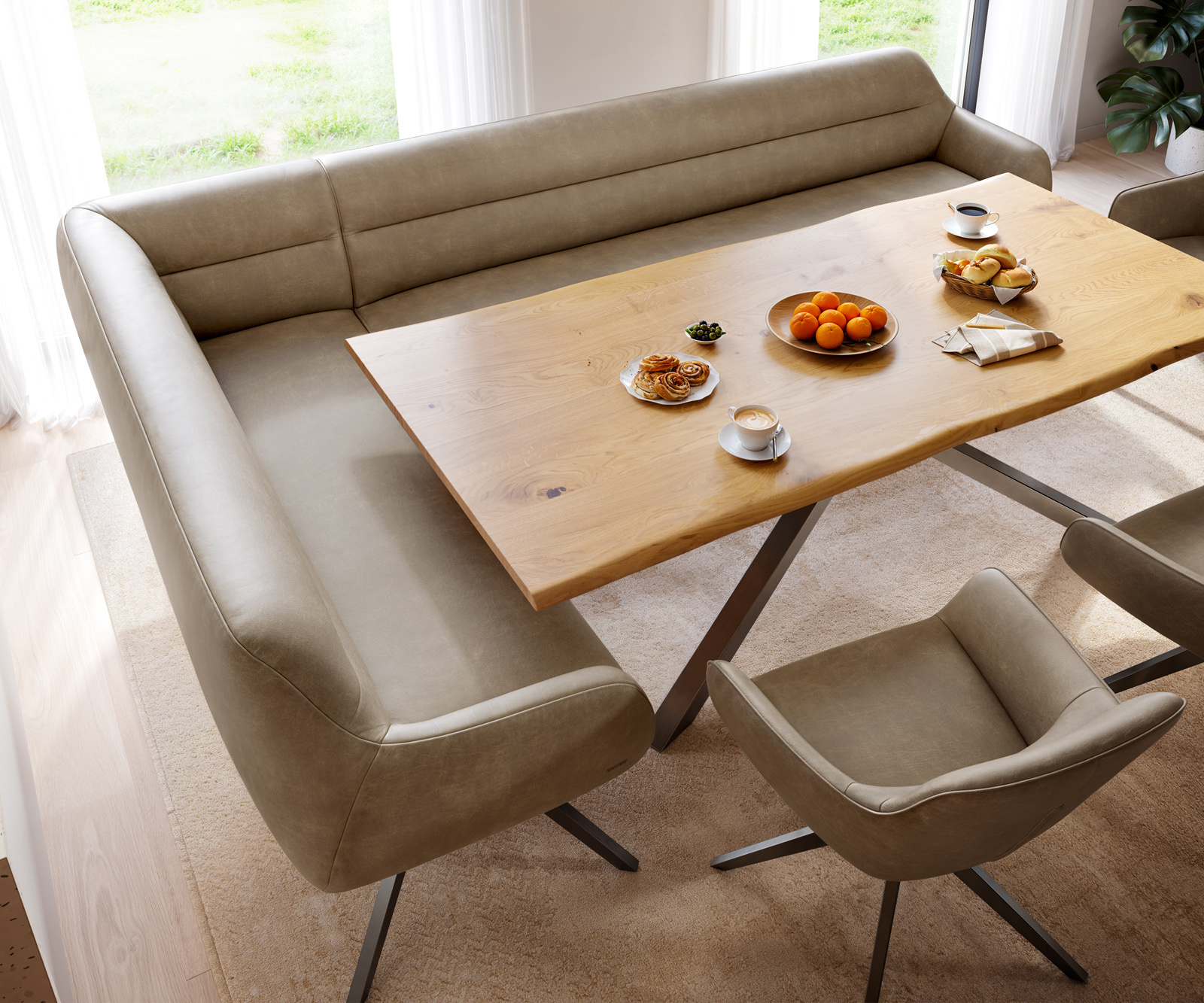 Rohová lavica Taya je súčasťou nášho premysleného systému a ideálne sa kombinuje s našimi stoličkami Flex a stolmi Edge. Tvary, línie a podstavy spolu dokonale ladia a vytvárajú harmonický celok v jedálni. Pre toto rohové riešenie sú obzvlášť vhodné stoly Edge s dĺžkou 2 metre. K tomu odporúčame stoličky Flex Yago, Zoa, Pejo, Heira alebo Xana, ktoré si môžete na želanie vybrať v rovnakom poťahu. Tak vznikne jedálenský priestor, ktorý ukazuje cit pre štýl – dokonale zladený a plný charakteru.