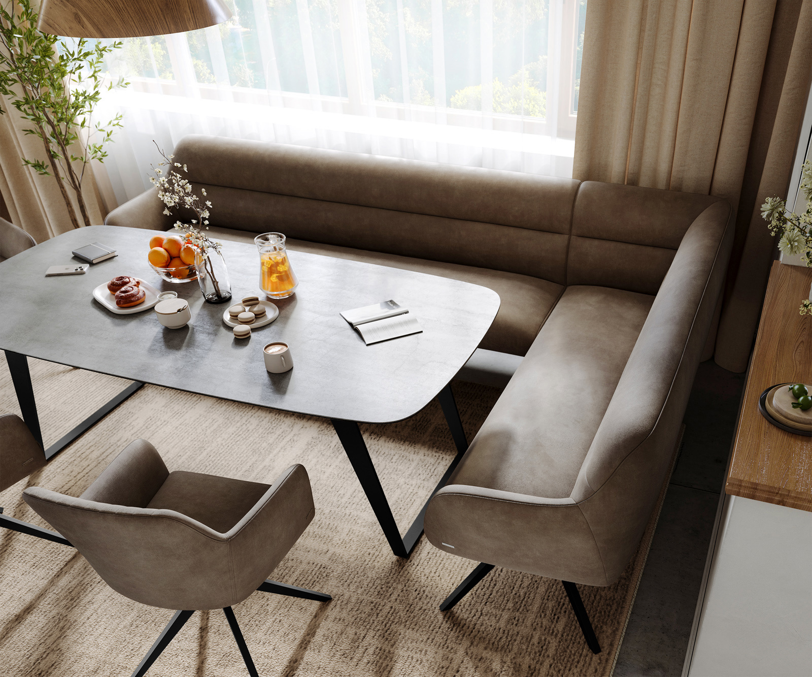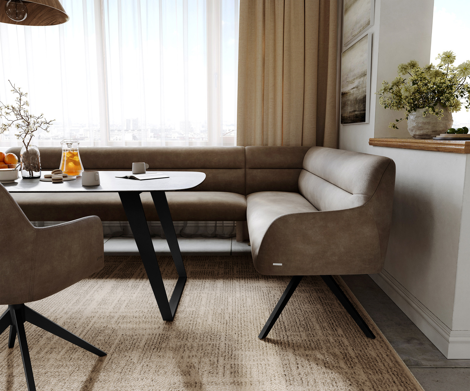 Rohová lavica Taya je súčasťou nášho premysleného systému a ideálne sa kombinuje s našimi stoličkami Flex a stolmi Edge. Tvary, línie a rámy spolu dokonale ladia a vytvárajú harmonický celok v jedálni. Pre toto rohové riešenie sú obzvlášť vhodné stoly Edge s dĺžkou 2 metre. K tomu odporúčame stoličky Flex Yago, Zoa, Pejo, Heira alebo Xana, ktoré si môžete na želanie vybrať v rovnakom poťahu. Tak vzniká jedálenský priestor, ktorý vyjadruje štýl – dokonale zladený a plný charakteru.
