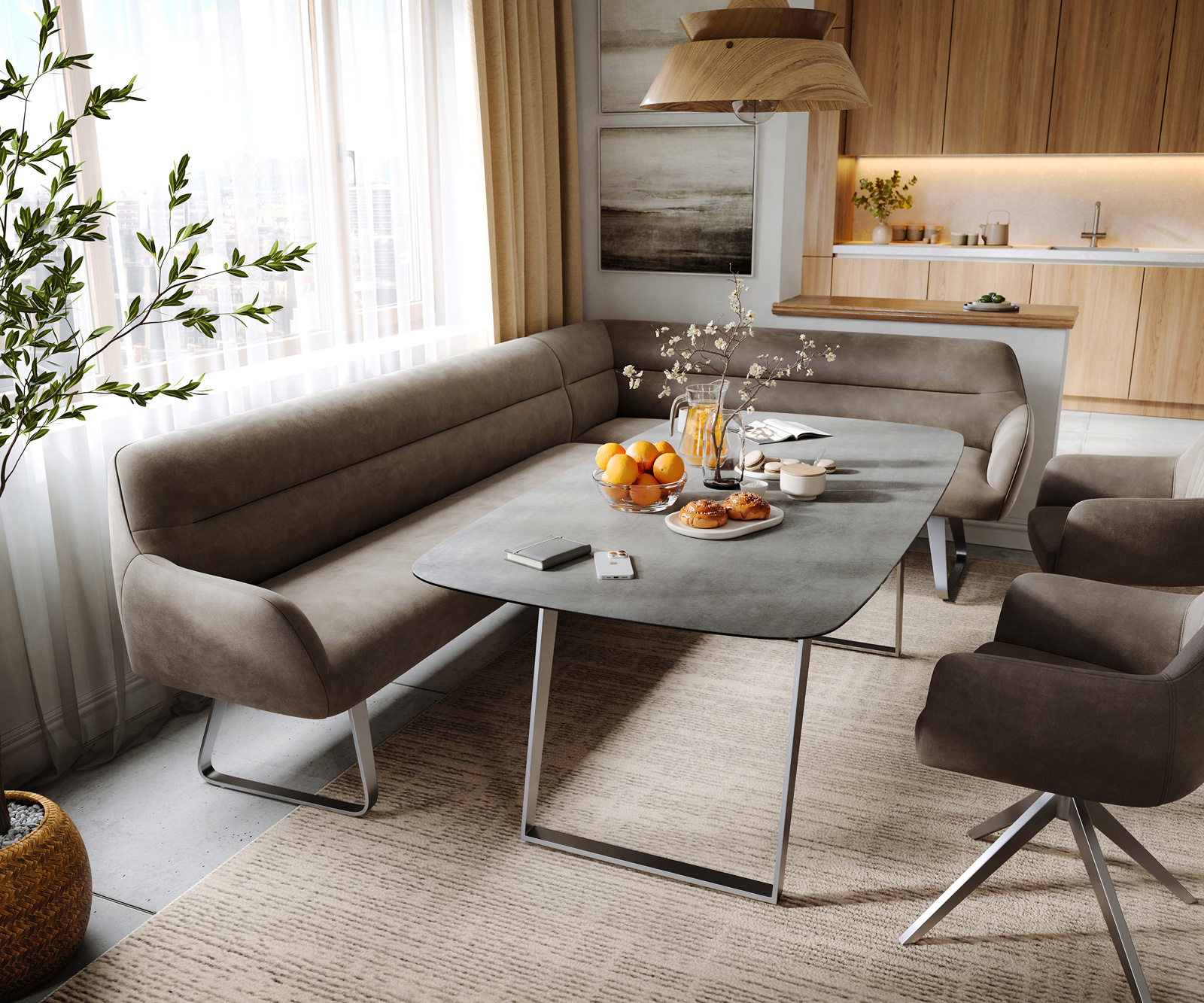 Rohová lavica Taya je súčasťou nášho premysleného systému a ideálne sa kombinuje s našimi stoličkami Flex a stolmi Edge. Tvary, línie a rámy spolu dokonale ladia a vytvárajú súdržný celok v jedálni. Pre toto rohové riešenie sú obzvlášť vhodné stoly Edge s dĺžkou 2 metre. K tomu odporúčame stoličky Flex Yago, Zoa, Pejo, Heira alebo Xana, ktoré si môžete na želanie vybrať v rovnakom poťahu. Tak vznikne jedálenský priestor, ktorý vyjadruje cit pre štýl – perfektne zladený a plný charakteru.