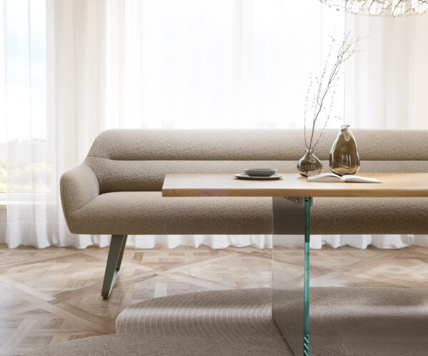 Plochý rám v tvare lyžín dodáva jedálenskej lavici moderný a ľahký vzhľad. Šikmo vedené, jemne zaoblené línie vytvárajú elegantnú, otvorenú siluetu. Vďaka súvislej forme vzniká harmonická rovnováha medzi stabilitou a dizajnom.