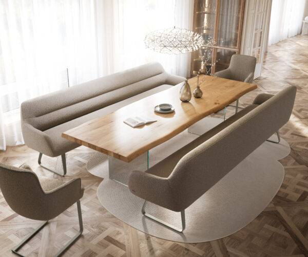 Naše stoličky Flex a stoly Edge dokonale nadväzujú na dizajnový jazyk lavice: tvary, línie a rámy spolu harmonicky ladia. Stoly Edge s dĺžkou 3 metre sú na to optimálne prispôsobené. K tomu odporúčame stoličky Flex Yago, Zoa, Pejo, Heira alebo Xana, ktoré si môžete na želanie vybrať v rovnakom poťahu. Tak vznikne jedálenský priestor, ktorý vyjadruje cit pre štýl – perfektne zladený a plný charakteru.