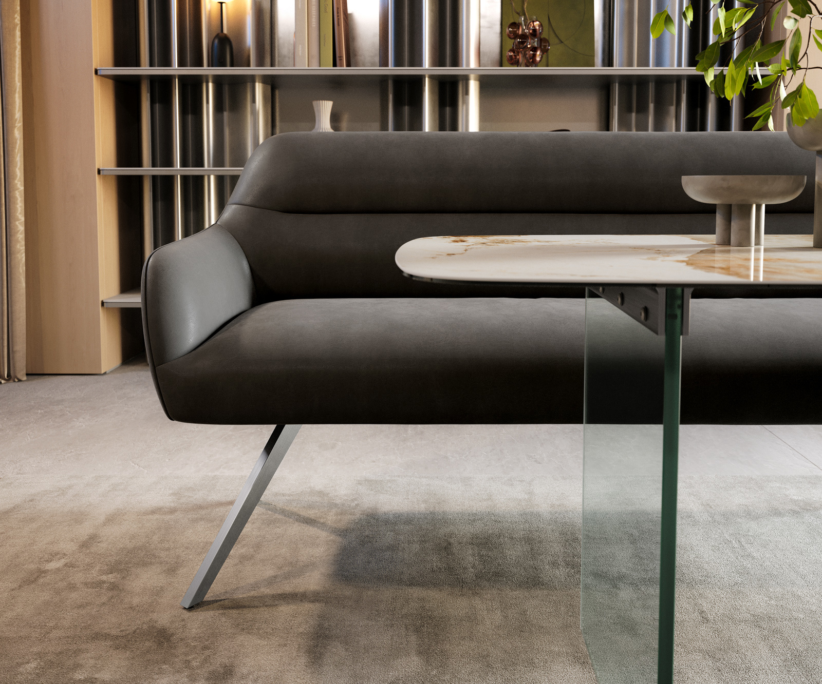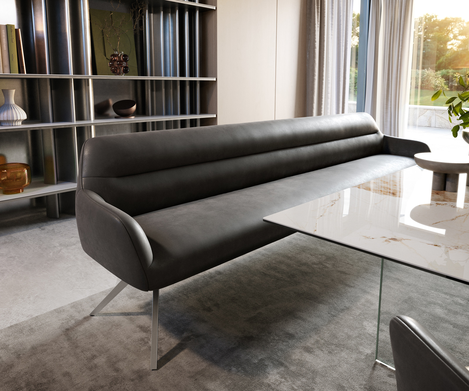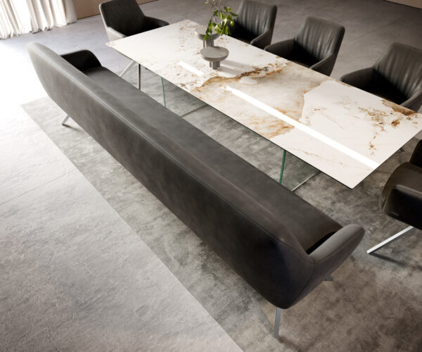 Naše stoličky Flex a stoly Edge dokonale nadväzujú na dizajnový jazyk lavice: tvary, línie a podstavy spolu harmonizujú. Stoly Edge v dĺžke 3 metre sú na to optimálne prispôsobené. K tomu odporúčame stoličky Flex Yago, Zoa, Pejo, Heira alebo Xana, ktoré si môžete podľa želania vybrať v identickom poťahu. Tak vznikne jedálenský priestor, ktorý ukazuje cit pre štýl – dokonale zladený a plný charakteru.