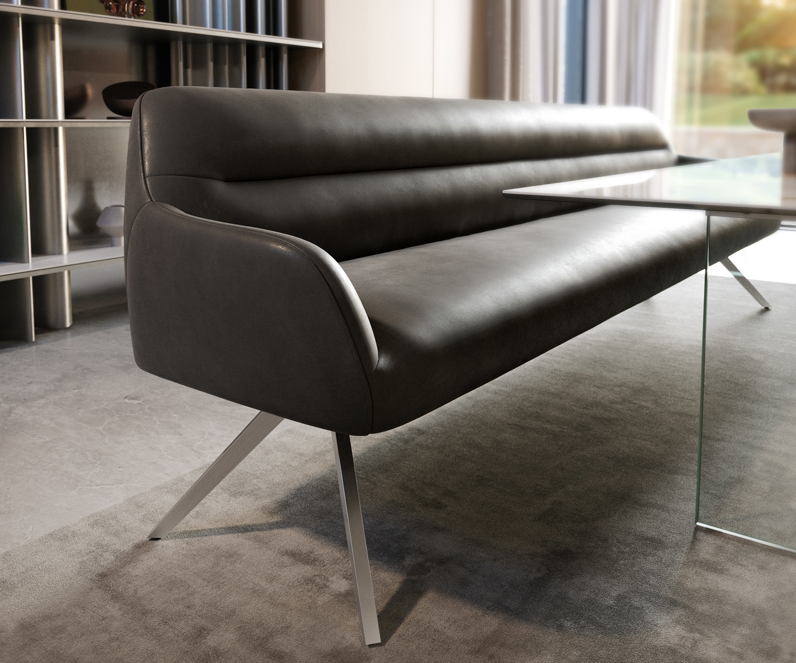 Jedálenská lavica Taya-Flex 300 cm mikrovlákno antracitová vintage krížová podstava hranatá nerezová oceľ vrecková pružina