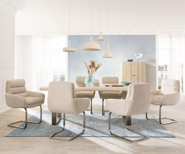 Abelia pôsobí so svojimi integrovanými a príjemne čalúnenými opierkami rúk obzvlášť elegantne a majestátne. Široká sedacia plocha s dizajnom voľných vankúšov robí stoličku nielen mimoriadne pohodlnou, ale aj štýlovým pútačom pozornosti vo vašej jedálni.