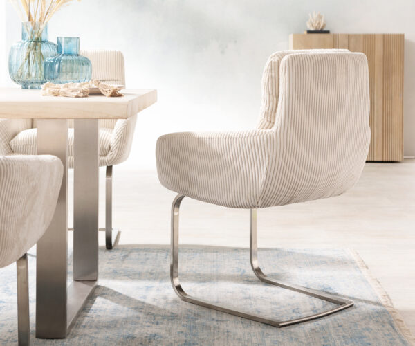 Stolička je čalúnená trendy manšestrovou látkou v teplom béžovom odtieni. Je veľmi príjemná na dotyk, zároveň však mimoriadne odolná a nenáročná na údržbu.