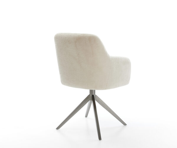 Ušľachtilý plyšový poťah v jemnej krémovo-bielej farbe dodáva stoličke obzvlášť elegantnú charizmu. Mäkký povrch poskytuje najvyšší komfort sedenia – ideálne pre moderné jedálne a obývacie priestory s kvalitným zariadením.