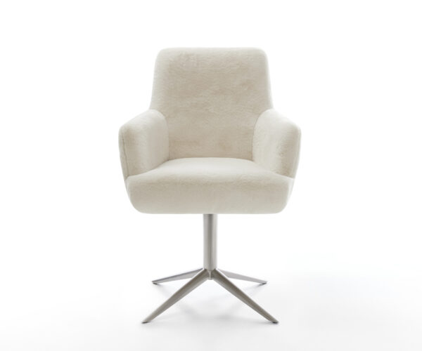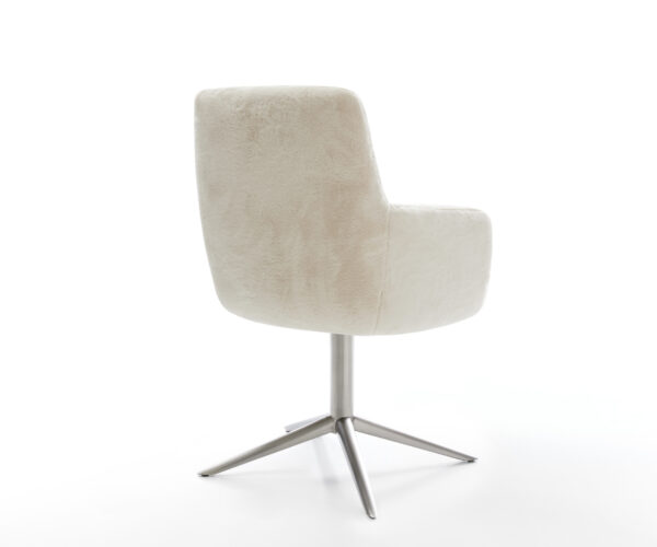 Luxusný plyšový poťah v jemnej krémovo-bielej farbe dodáva stoličke obzvlášť elegantnú charizmu. Mäkký povrch ponúka najvyšší komfort sedenia – ideálne pre moderné jedálne a obytné priestory s kvalitným zariadením.