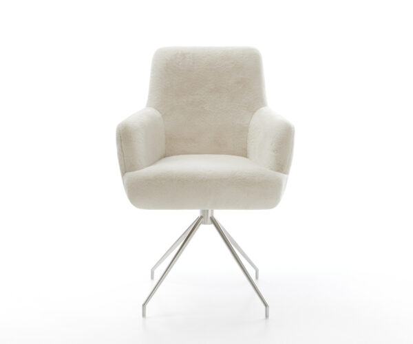 Luxusný plyšový poťah v jemnej krémovo-bielej farbe dodáva stoličke obzvlášť elegantnú charizmu. Mäkký povrch ponúka najvyšší komfort sedenia – ideálne pre moderné jedálne a obývacie priestory s kvalitným zariadením.