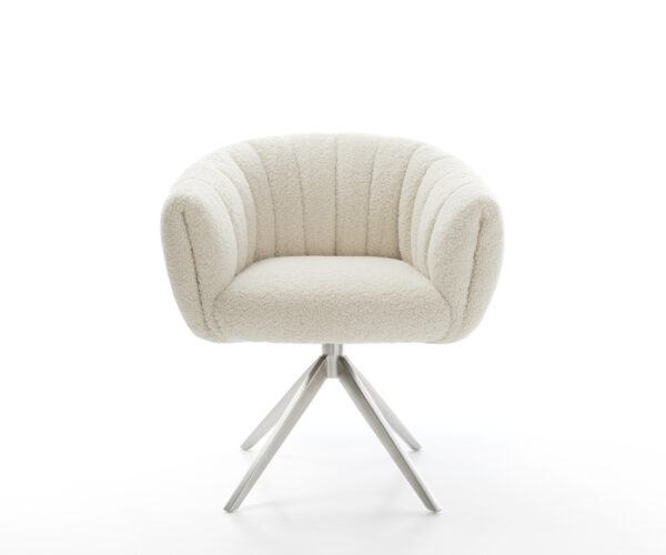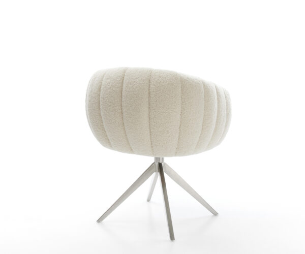 Čalúnenie z mäkkej teddy látky v béžovej farbe zabezpečuje obzvlášť príjemný pocit pri sedení. Jemná látka prináša pohodlie a štýl k jedálenskému stolu – ideálne pre útulnú atmosféru.