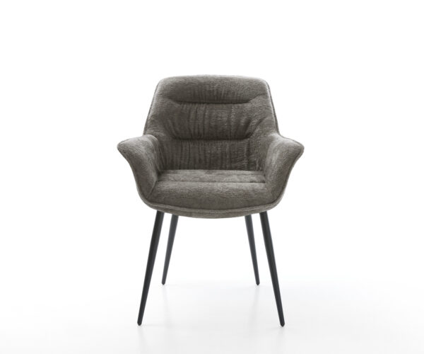 Táto stolička zaujme kvalitným poťahom z bouclé v teplom tmavobéžovom odtieni. Jemná štruktúra a pokojná farba dodávajú nábytku modernú, útulnú charizmu – ideálne do jedálne alebo čitárne.