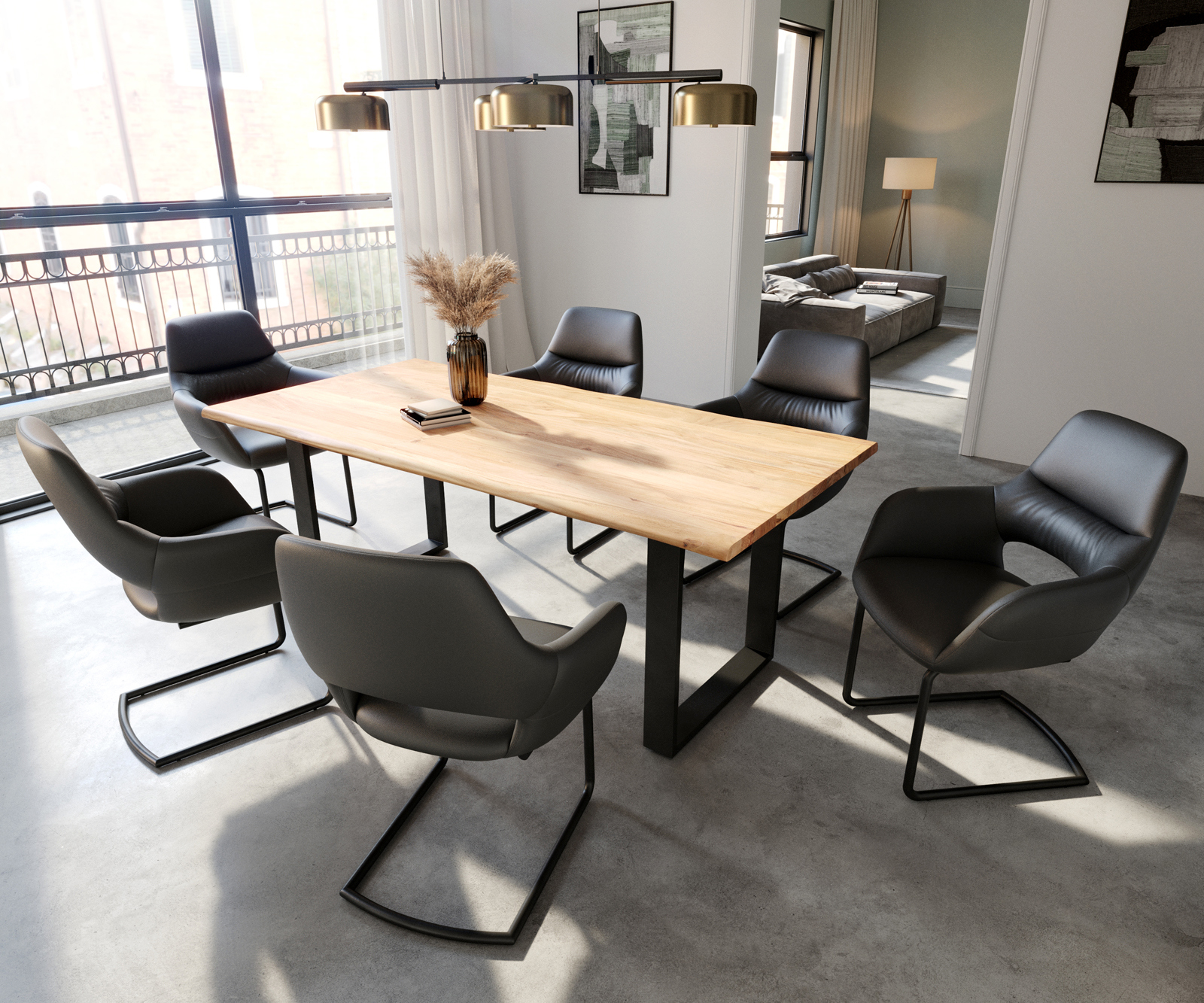 Okrúhla podstava je v klasickom tvare freischwinger. To ju nielen robí mimoriadne elegantnou, ale vďaka ľahkej hojdacej funkcii podporuje zdravé držanie tela a pohodlné sedenie.