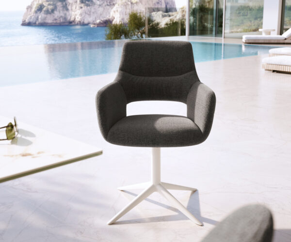 Potiahnutá krížová podstava s hojdacou funkciou spája vzdušnú ľahkosť s citeľne vyšším komfortom. Jemne reaguje na pohyby, podporuje dynamické sedenie a zároveň robí stoličku pripravenou na vonkajšie použitie. Stabilná, odolná voči poveternostným vplyvom a štýlová sprevádza oddychové chvíle na terase a balkóne rovnako ako v interiéri.