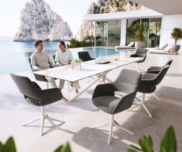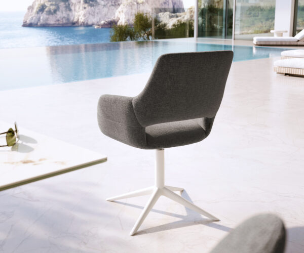 Yago-Flex prináša pocit domova z interiéru do exteriéru. S priehľadným operadlom, jemne sa zužujúcimi opierkami a jemným ozdobným prešitím pôsobí ľahko, elegantne a nádherne útulne. Vodopriepustná komfortná pena podporuje použitie vonku a robí z neho štýlovú voľbu na terasu, balkón aj do interiéru. Tak vzniká jedálenská stolička do exteriéru, ktorá pôsobí v každom prostredí mimoriadne harmonicky.