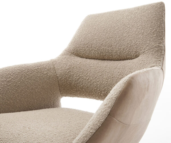 Zaujímavá kombinácia materiálov z mikrovlákna na vonkajšej strane a bouclé robí z tejto jedálenskej stoličky nevyhnutný kúsok v každej vkusne zariadenej jedálenskej časti. Použitie dvoch materiálov je vizuálne mimoriadne atraktívne, či už ako samostatný kus alebo ako súčasť sedenia.