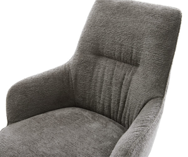 Táto stolička zaujme kvalitným poťahom z bouclé v teplom tmavobéžovom odtieni. Jemná štruktúra a pokojná farba dodávajú nábytku modernú, útulnú charizmu – ideálne do jedálne alebo čítacieho kútika.