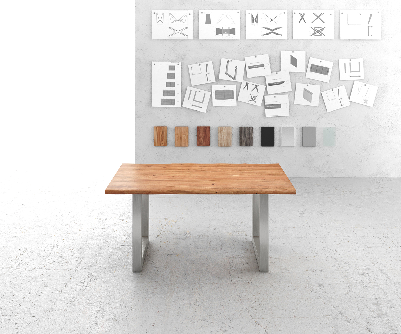 Široká tenká podstava z vynikajúco spracovanej nerezovej ocele dokonale dopĺňa dizajn stola konzistentne príťažlivým spôsobom. Strieborný, hladký nerezový kov vytvára fascinujúci kontrast k pôsobivým vlastnostiam stolovej dosky a podporuje jej úžasný efekt obzvlášť príjemne a harmonicky.