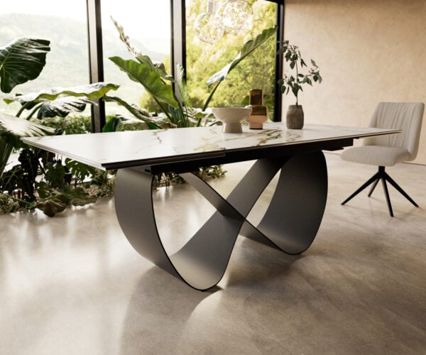 Inšpirovaný symbolom nekonečna a jemnými krídlami motýľa je aj rám tvojho rozkladacieho stola Edge skutočným dizajnovým skvostom. Vyrobený z odolného, práškovo lakovaného kovu, dokonale dopĺňa elegantný vzhľad tvojho stola a vytvára jedinečný akcent v tvojej jedálni.
