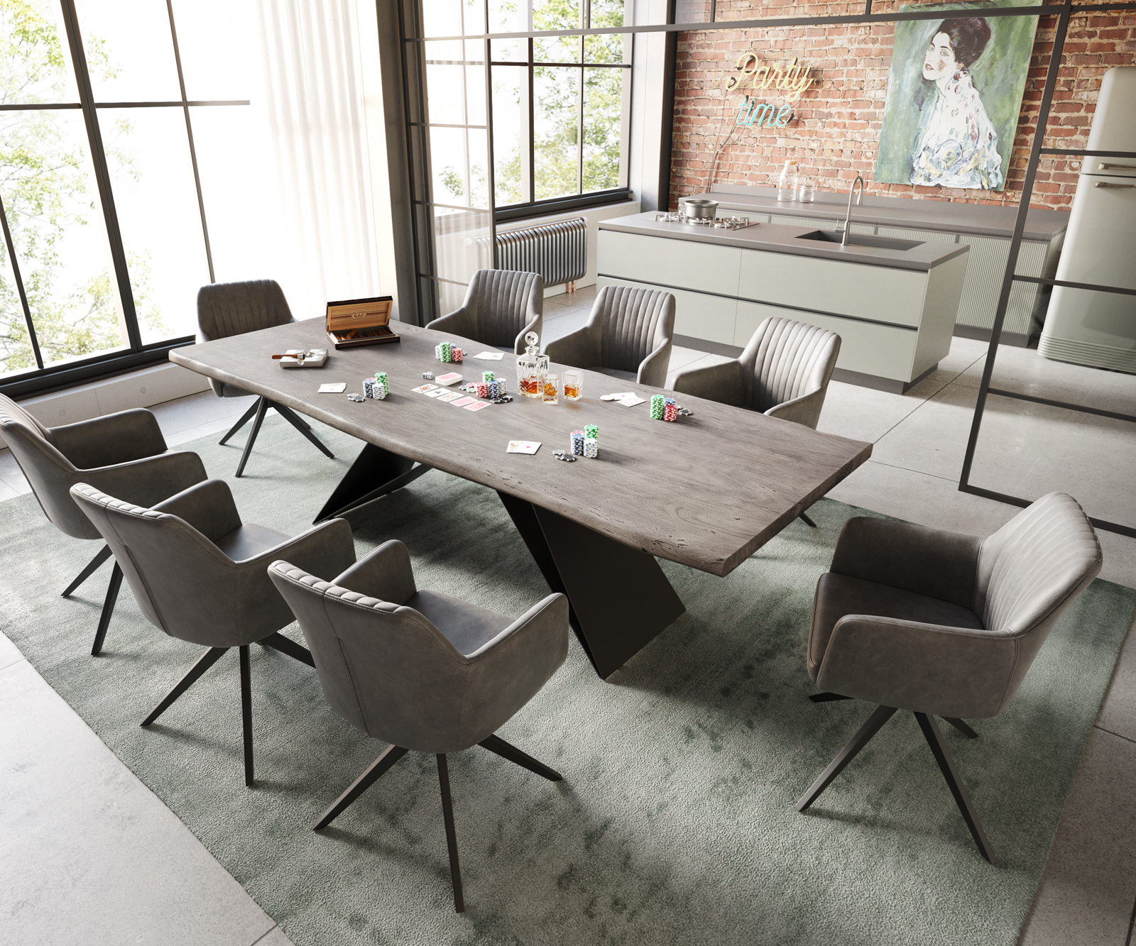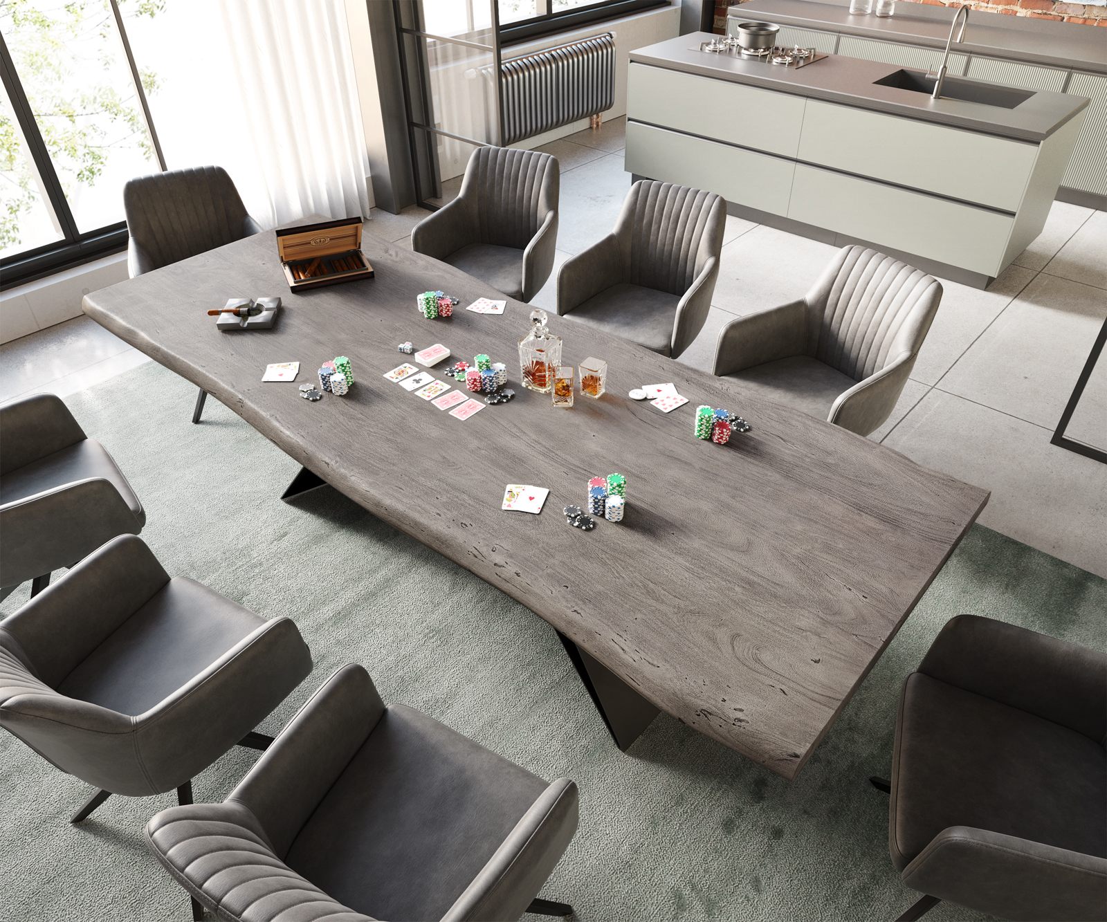 Vyrobený z obzvlášť tvrdého akáciového dreva, stôl Live-Edge zaujme svojimi jemne zakrivenými, prírodnými hranami stromu a exkluzívnym, striebristo lesklým platinovým odtieňom. Vysokokvalitné spracovanie masívneho dreva a jeho atmosférický dizajn robia z tohto jedálenského stola extravagantné centrum tvojej jedálne. Každý stôl Live-Edge je jedinečný originál, ktorý pritiahne obdivné pohľady, no zároveň sa harmonicky začlení do mnohých štýlov zariadenia. Klasická obdĺžniková stolová doska ponúka vynikajúci komfort miesta a vďaka mimoriadne vysokej kvalite odoláva každodenným nárokom obzvlášť dobre.