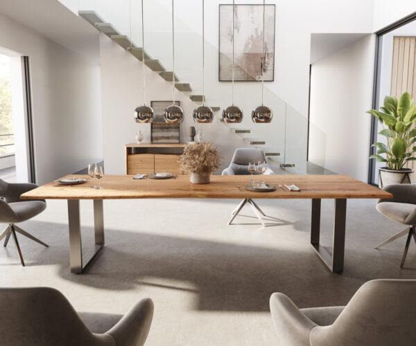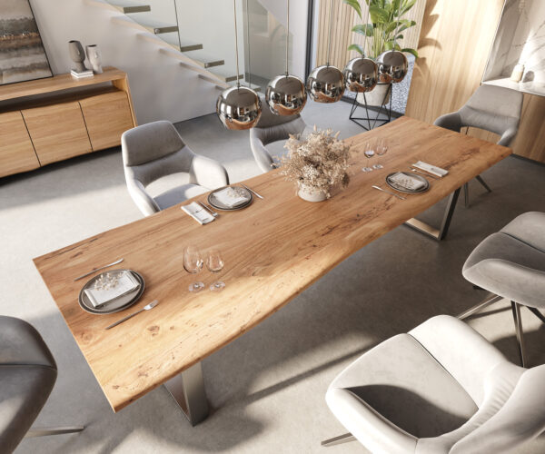 So štíhlym tenkým podstavcom z nerezovej ocele si správne vyberáte jeden z našich najobľúbenejších stolov z rady Edge. Výborne spracovaný strieborný podstavec perfektne ladí s každým zariadením a dodáva stolu šikovný mix rustikálnej prirodzenosti a príťažlivej elegancie.