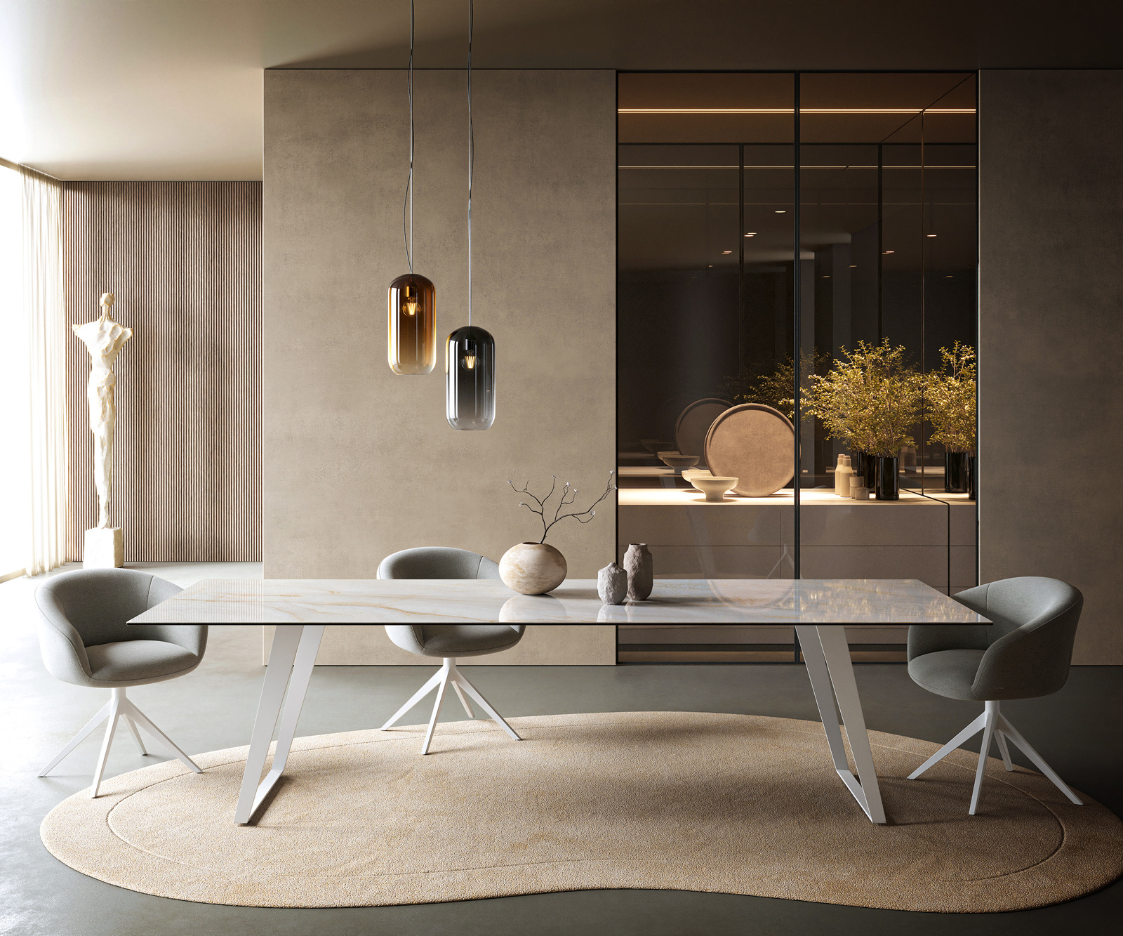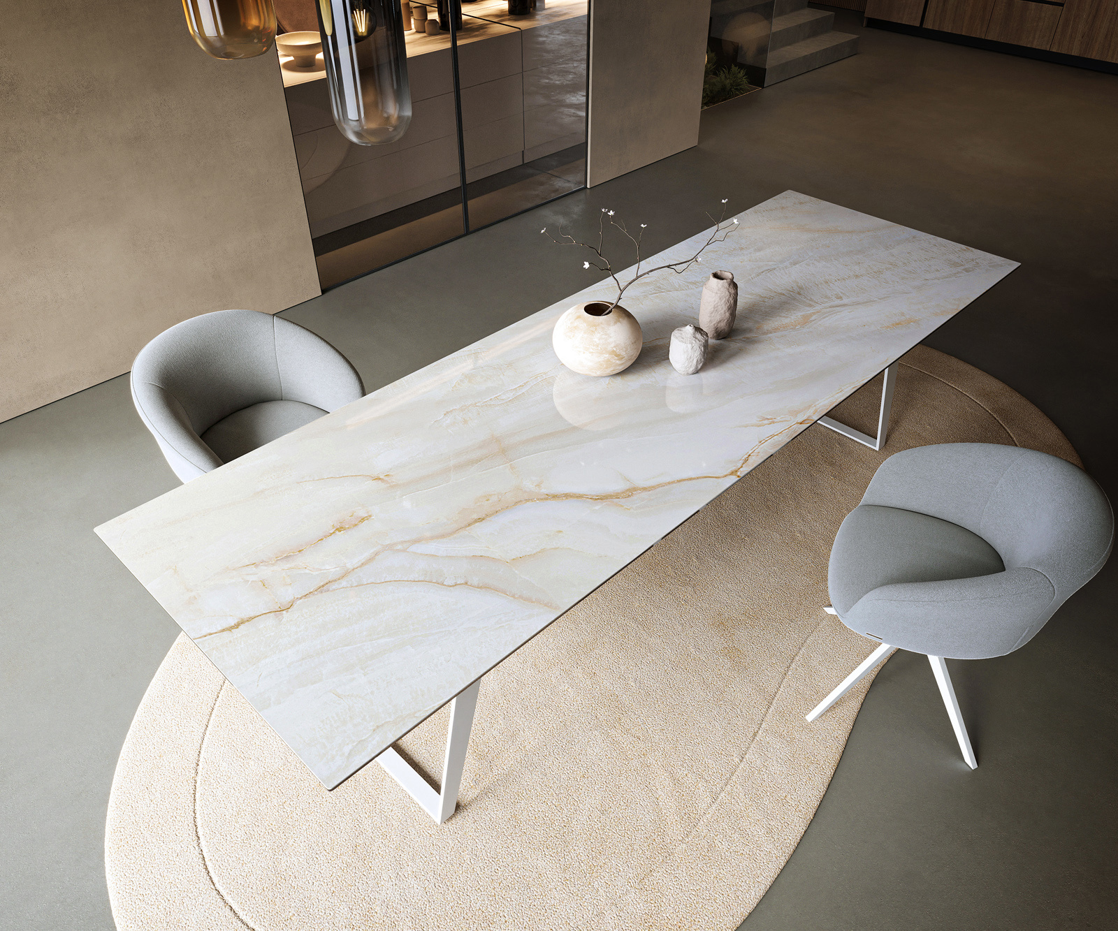 Ako tichý moment svetla na kameni: Jedálenský stôl Edge v obdĺžnikovom tvare pôsobí zároveň jasne a priestranne. Vďaka leštenému povrchu vzniká ušľachtilý lesk, ktorý jemne zachytáva svetlo a necháva ho plávať cez krémovú, perleťovo sivú a teplé zlaté žilky. Inšpirovaný pôvabom pravého onyxu – prírodného kameňa známeho svojou hlbokou, takmer žiarivou eleganciou – získava stôl obzvlášť luxusnú charizmu. Priama forma dodáva dizajnu vzdušnosť, usporiada priestor a mení každú večeru na scénu nadčasovej estetiky.