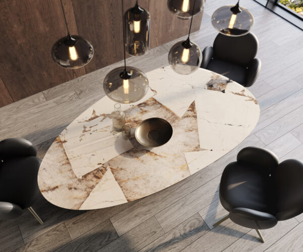 Stôl, ktorý je nezabudnuteľný! Majstrovsky vyrobený spoločnosťou Iris FMG, jedným z najlepších výrobcov keramických dosiek, z jedného kusu kvalitnej keramiky, jedálenský stôl Edge žiari pôsobivou kompozíciou silných tvarov v elegantnom farebnom prevedení rôznych odtieňov hnedej a bielej bez prerušenia alebo škár. Jemné žilkovanie ušľachtilého zlatého tónu obklopuje prirodzený obrys a dodáva dizajnu štýlový kontrast, ktorý upúta všetky pohľady. Vysoký podiel skla zabezpečuje jedinečný, priehľadný hĺbkový efekt s rôznou mierou lesku. Vďaka najmodernejšej technike na trhu prekonáva Iris FMG najvyššie štandardy kvality v trvanlivosti a dizajne. Oválny tvar nádherne zvýrazňuje jedinečný, extravagantný vzhľad stola. Jemne štruktúrovaný povrch stimuluje tvoje zmysly a umožňuje ti cítiť a zažiť pôsobivú auru, ktorú tento jedálenský stôl vyžaruje až po končeky prstov.