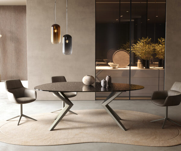 Elegantná podstava ťa nadchne svojím náročným dizajnom. Odlahčuje stôl a prináša do tvojej jedálne elegantnú ľahkosť. Podstava z kvalitného kovu bola v mnohých pracovných krokoch upravená cennými pigmentmi a získala tak elegantný titanový efektový povrch, ktorý žiari v tajomných odtieňoch.