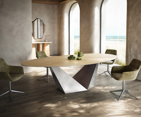 S týmto stolom Edge premeníš svoju jedáleň a vytvoríš jej príjemnú a krásnu atmosféru. Oválnu stolovú dosku vyrobili z pravého Laminam® keramiky z Talianska. Táto keramika má po celom svete vynikajúcu povesť a odborníci ju chvália pre jej úžasnú nenáročnú údržbu a precízne napodobnenie cenných farieb a materiálov. Majstrovské remeslo sa najkrajšie prejavuje práve na tejto elegantnej doske. Jemné farebné odtiene, ktoré pripomínajú ušľachtilé dubové drevo, boli inšpirované jedinečnými pieskovými tónmi pred slávnou benátskou lagúnou a vyžarujú pokojnú a fascinujúco prirodzenú krásu. Hladký povrch bol tak starostlivo upravený, že sa jemne, takmer mäkko dotýka. Takýto jedálenský stôl si ešte nikdy nezažil – prívetivý, citlivý a príjemný.