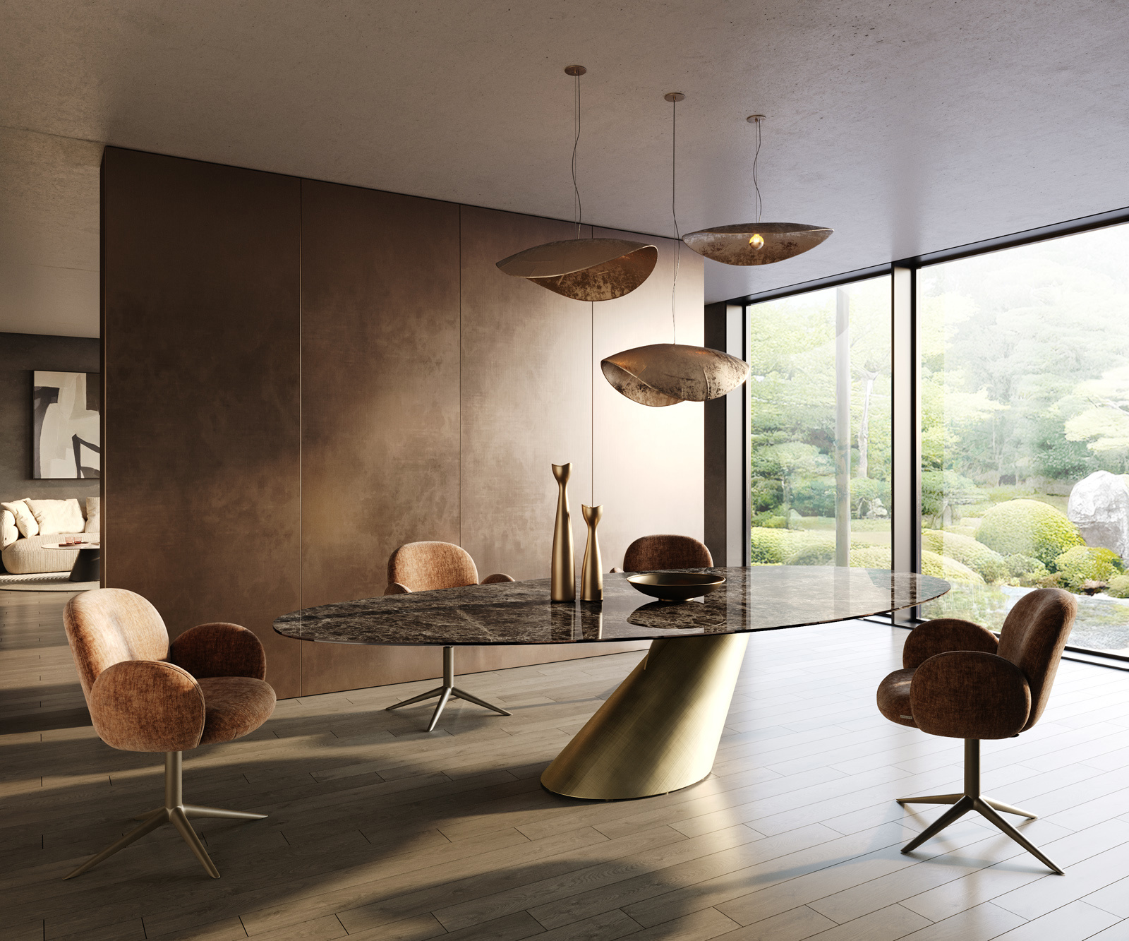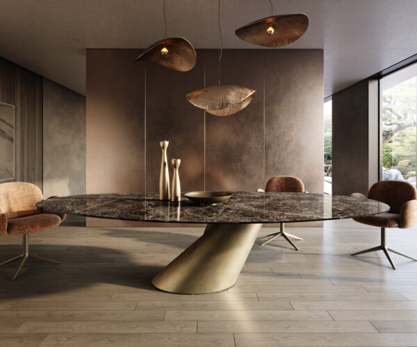 Jedálenský stôl Edge oválny 315×150 cm keramika emperador extra lucidato tmavohnedá kužeľ metalická zlatá
