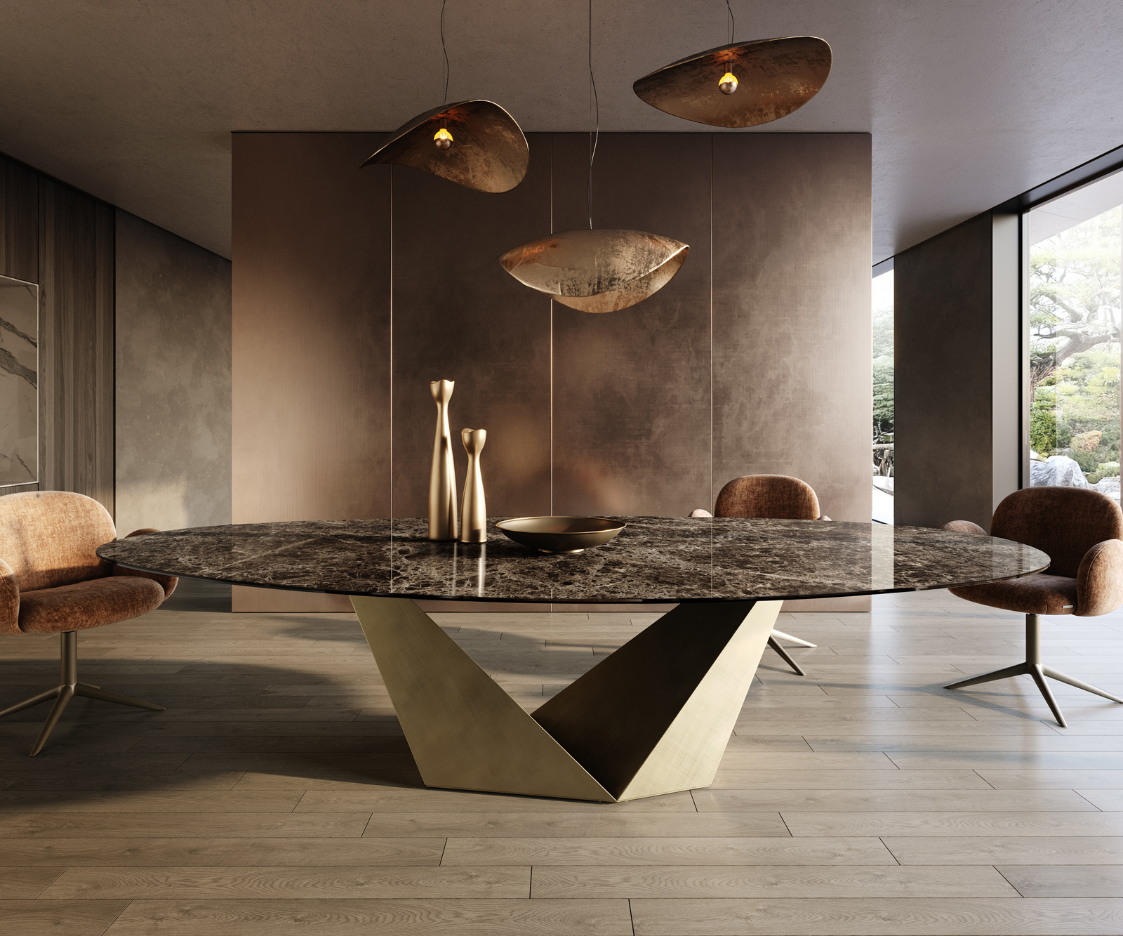 Jedálenský stôl Edge oválny 315×150 cm keramika Emperador Extra Lucidato tmavohnedá Prisma metalická zlatá