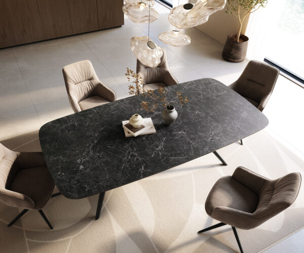Stôl Edge z pravého Laminam® keramiky v odtieni Nero Greco antracit – v elegantnom oválnom tvare