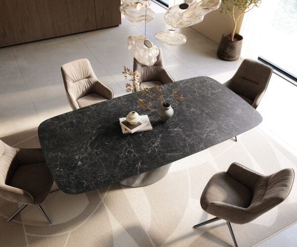 Stôl Edge z pravého Laminam® keramiky v odtieni Nero Greco antracit – v elegantnej oválnej forme