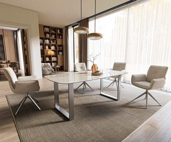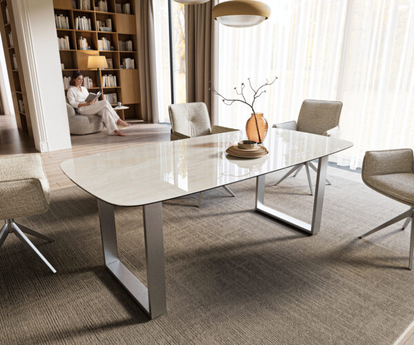 Široká tenká podstava z vynikajúco spracovanej nerezovej ocele dokonale dopĺňa dizajn stola konzistentne príťažlivým spôsobom. Strieborná, hladká nerezová oceľ vytvára fascinujúci kontrast k pôsobivým vlastnostiam stolovej dosky a podporuje jej nádherný efekt obzvlášť príjemne a harmonicky.
